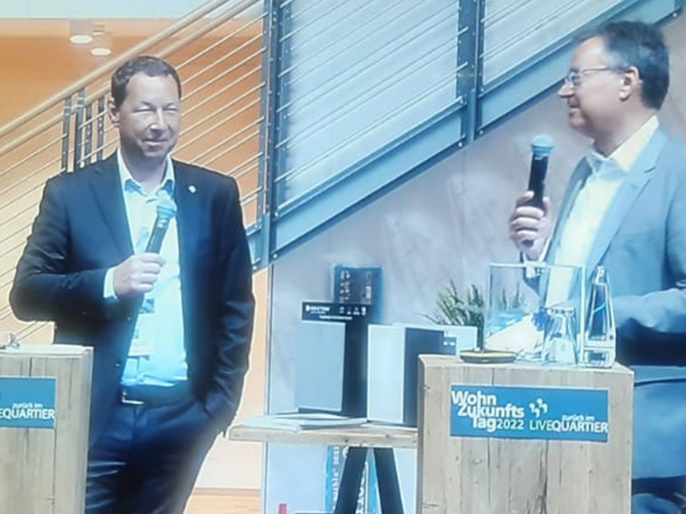 GdW Präsident Axel Gedaschko & Organisator Joachim Eckert präsentieren das Haus der Zukunft in Berlin beim